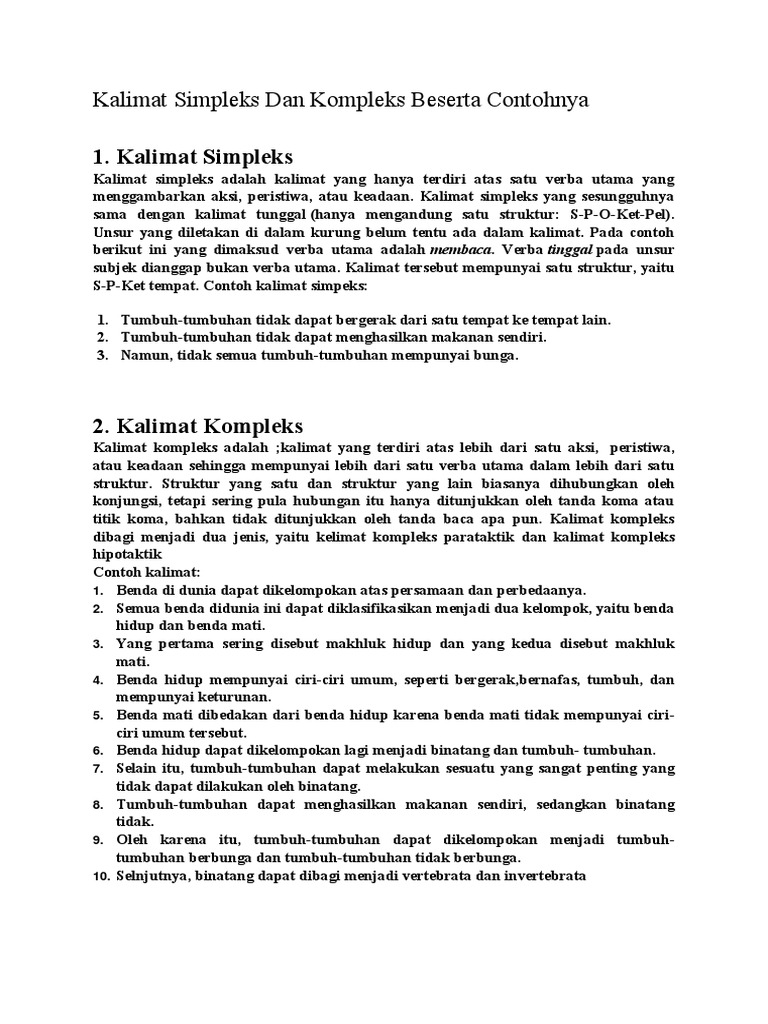 Kalimat kompleks adalah gabungan dari beberapa kalimat simpleks atau klausa. Konjungsi eksternal ialah sebuah kata yang dipakai untuk menggabungkan satu kalimat dengan kalimat lain. Dalam interaksi tersebut pasti ada percakapan yang akan dilakukan dengan lawan bicara anda. 1 kalimat simpleks dan kompleks kalimat kompleks kalimat yang hanya memiliki satu verba utama. Yaitu kalimat simpleks dan kalimat kompleks. Ini dikarenakan kalimat simpleks hanya mempunyai satu. Pengertian kalimat simpleks dan kompleks. Mulai dari pengertian kalimat simpleks, pengertian kalimat kompleks, macam macam kalimat kompleks, contoh kalimat simpleks, contoh kalimat kompleks, dll. Unsur inti (komponen inti) dalam satu kalimat simpleks hanya berisi satu informasi, yang ditandai dengan adanya fungsi predikat. Oleh karena itu, kalimat simpleks bisa juga disebut dengan kalimat yang tunggal. Informasi yang disampaikan dalam kalimat simpleks akan menjadi jelas, dan mudah dipahami. Pengertian paragraf, kalimat utama/kalimat pokok, kalimat penjelas. Kalimat simpleks memiliki struktur penyusunan kalimat secara spo.